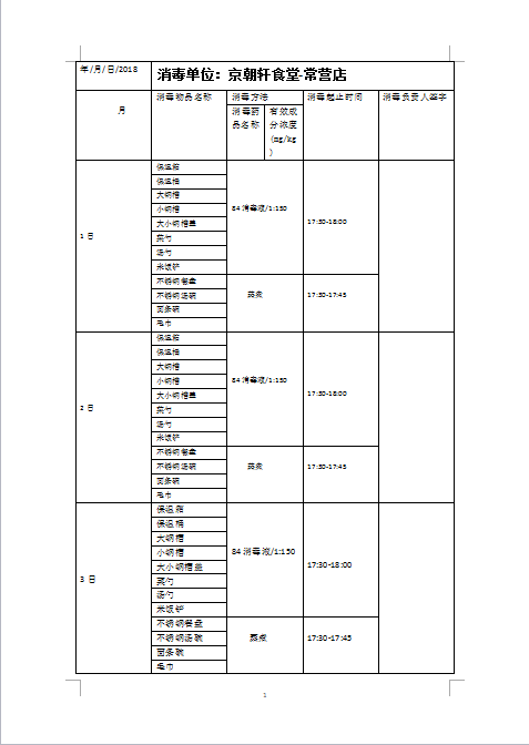 食堂承包消毒記錄單